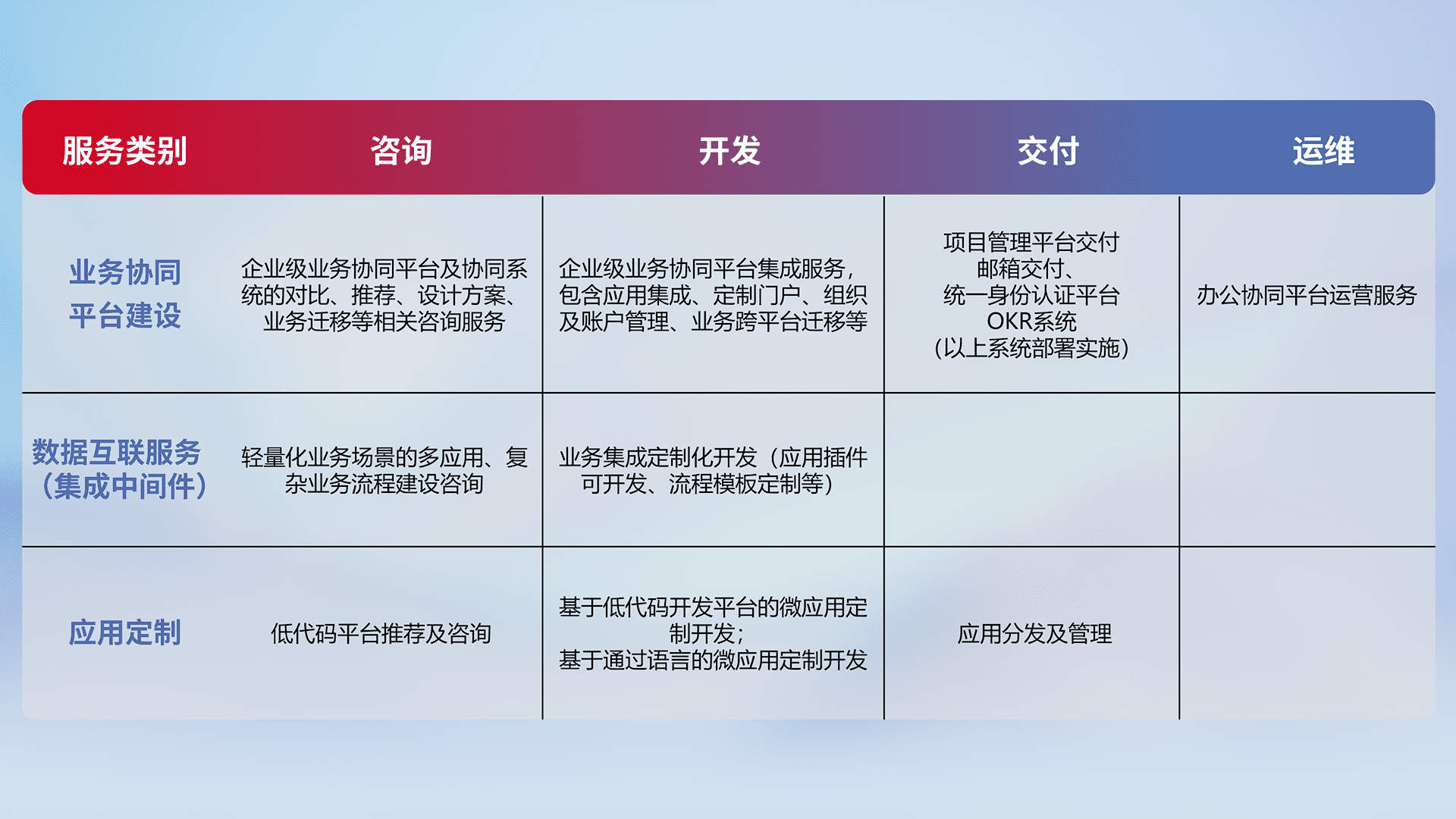针对钉钉、、、、企微、、IDaas等平台级产品提供产品的规划、、、、方案、、、交付、、、、定制化开发等服务,,实现如统一协同办公、、智能客户服务、、混合会议管理、、、、智能数据查询、、、等业务场景,,,实现数字化转型。。